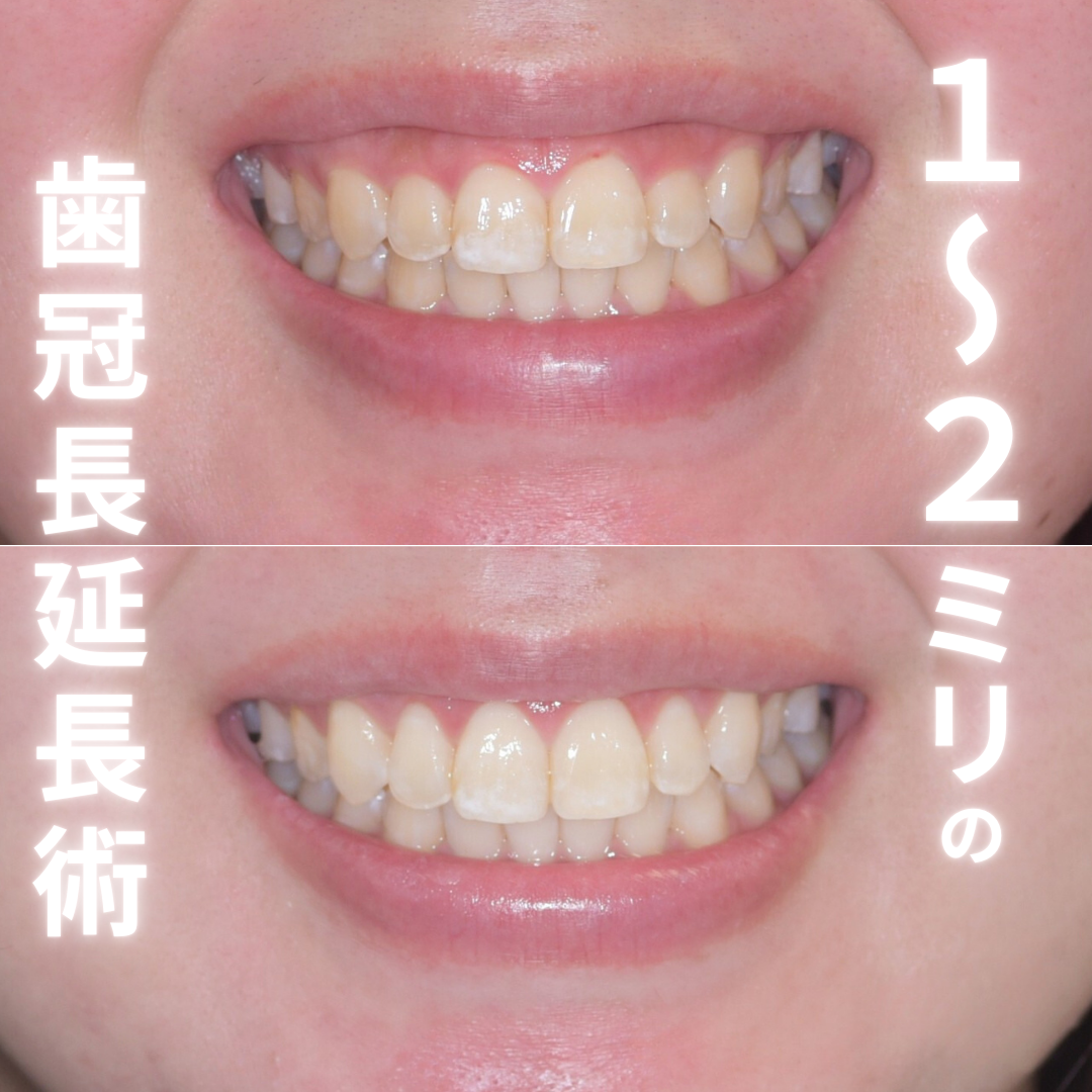 歯冠長延長術とは、歯の頭の部分である歯冠がより広範囲に見えるようする外科手術です。歯茎を切除し、骨の形態を整えます。ガミースマイルの軽度から中等度の症例に適応されることが多い術式です。 短期間で治療が完了し、後戻りも起こりにくい施術法です。これは歯冠長延長術が歯茎と骨に調整を加える処置だからです。セラミック矯正などを併用することで、理想的な口元を長期間キープするのも難しくありません。
