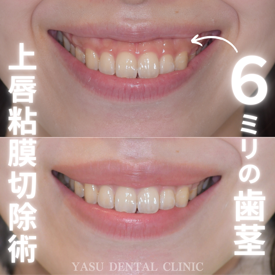 上唇粘膜切除術とは、上唇が上がりすぎないように口の内側の粘膜の一部を切除する治療です。傷口が人にわかることは無く、治療の跡もほぼ残りません。