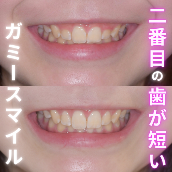 前から2番目の歯が短いガミースマイルを治療した症例(歯冠長延長術) 2026.03.16 歯を削らずにガミースマイルと前歯のすきっ歯(翼状捻転)を治した症例(部分矯正・歯冠長延長術) 2026.02.20 20代の歯科衛生士さんも驚いた 人生初の歯科麻酔でも「痛くなかった」ガミースマイル治療(歯冠長延長術・骨隆起除去) 2026.01.27 矯正後にガミースマイルが目立つようになった方へ|歯が短くなったケースを歯冠長延長術で改善した症例(歯冠長延長術) 2026.01.20 6mmのガミースマイルを上唇粘膜切除術で治療した症例(上唇粘膜切除術) 2026.01.08 リップリポジショニング(上唇粘膜切除術)後悔 2025.12.26 1〜2mmで変わるガミースマイル治療No.2(歯冠長延長術) 2025.12.02 当院のガミースマイル手術実績 2025.11.28 口ゴボの原因となる前方発育した骨隆起とガミースマイルを同時に改善した症例(骨隆起除去・歯冠長延長術) 2025.11.14 歯科衛生士さんの2〜3mm歯が短いガミースマイルを治療した症例(歯冠長延長術) 2025.10.27 口ゴボの原因の骨隆起とガミースマイルを同時に改善した症例(骨隆起除去・歯冠長延長術) 2025.10.07 治療後1週間の治りが違う!全国から集まる綺麗な治り(歯冠長延長術) 2025.09.27 ガミースマイル手術後1週間の治りが早い理由(歯冠長延長術) 2025.09.17 歯茎の高さを揃えたいとお越しになられたガミースマイルの患者様(歯冠長延長術) 2025.08.24 他院で歯冠長延長術とセラミック矯正をされた方のやり直し症例(歯冠長延長術・セラミック) 2025.08.06 有名芸能人(女優・モデル)のガミースマイル治療(歯冠長延長術) 2025.06.29 歯の長さ1.5〜3mm(平均2mm)で変わるガミースマイル治療(歯冠長延長術) 2025.06.06 セットバック整形手術で後悔しないために|ガミースマイルになる?失敗例から知るセットバック治療 2025.05.30 歯が短いガミースマイルと矮小歯を歯冠長延長術と削らないラミネートベニアで治療した症例(歯冠長延長術・セラミック) 2025.05.10 2〜3mmで変わるガミースマイル治療No2(歯冠長延長術) 2025.05.02 2〜3mm歯が長くなると、大きく変わるガミースマイル(歯冠長延長術) 2025.04.12 2mmで変わるガミースマイル治療.No2(歯冠長延長術) 2025.03.23 1〜2mmで変わるガミースマイル治療(歯冠長延長術) 2025.03.05 口ゴボの9mmのガミースマイルを上唇粘膜切除術で治療した症例(上唇粘膜切除術) 2025.03.01 2種類のガミースマイル手術を併用した症例(歯冠長延長術・上唇粘膜切除) 2025.02.26 2〜3mmで変わるガミースマイル治療(歯冠長延長術) 2025.02.12 口ゴボの原因となる骨隆起の除去とガミースマイルを同時に治療した症例(骨隆起除去・歯冠長延長術) 2025.01.08 歯茎の輪郭にこだわったガミースマイル治療(歯冠長延長術) 2025.01.01 1 2 3 … 5 » 人気記事 ガミースマイルは気持ち悪い印象になる?コンプレックスを感じている方へ18.6k2022年10月3日 【ガミースマイル】歯冠長延長術のメリットやデメリット、ダウンタイムについて9.3k2022年5月21日 笑うと上唇が薄くなるガミースマイルを治療した症例(上唇粘膜切除術)7.6k2021年5月29日 重度のガミースマイルってどんな状態?特徴と実際の症例を解説7k2022年9月30日