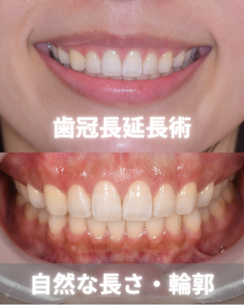 歯冠長延長術前後の比較になります。治療後は歯が長くなるだけでなく、歯茎に輪郭が丸みが出ることで柔らかい印象に変わりました。
