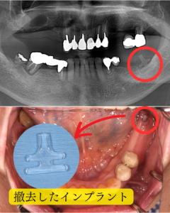 今では使用されてはいませんが、過去にはこのような板状のブレード型のインプラントが度々使用されていました。インプラント周囲の骨は溶けてしまい、グラグラの状態だったので、撤去を行いました。