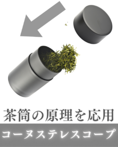 コーヌステレスコープとは、お茶の筒の原理を応用したものになります。お茶の筒は、上の蓋だけ持っても、下の筒が落ちる事はありません。これは、お茶の葉が湿気ないように、内部に空気が入らないように、ピッタリと蓋と筒がフィットしている構造となっています。これを入れ歯の維持安定に応用したのが、コーヌステレスコープ入れ歯となります。