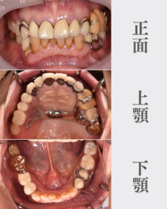 残っている歯にクラスプと言われるフックをかけて安定をさせる、部分入れ歯を使用されていました。クラスプの一部の歯は負担に耐える事ができなかったのか、数年前に抜歯になり、部分入れ歯が修理されている状態で、不安定な状態でした。