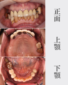 上の歯は、コーヌステレスコープとインプラントで支えられた総入れ歯で治療を行いました。もし将来的にご自身の歯が失われた場合も想定して、この形にしています。天然の歯が仮に1本2本と抜歯になったとしても、引き続きこの入れ歯をご使用して頂けるようにしています。次に起こるトラブルを予測して、もしもの時に対応しやすいようにしています。