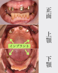 奥歯のグラグラの歯や、古いインプラントは撤去を行い、上下左右1本つづインプラントを使用して、入れ歯を補助的に支えています。