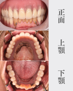 下の歯は、前歯6本は天然の歯をそのまま活用して、インプラントを支えに使い部分入れ歯を装着しています。